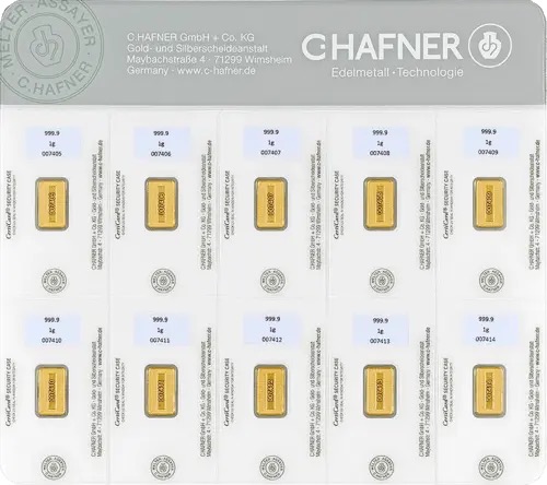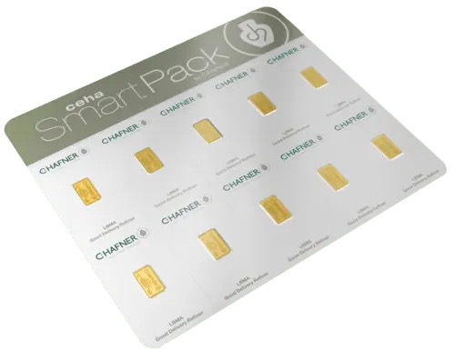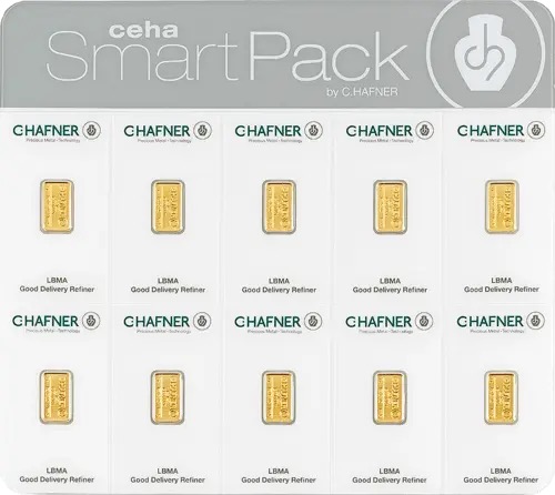 Das 10 x 1 g SmartPack von C.HAFNER vereint Flexibilität und Sicherheit: Zehn einzeln entnehmbare 1 g Feingoldbarren „999,9“ bieten eine attraktive Kombination aus fein abgestuftem Investment und hochwertiger Markenqualität.