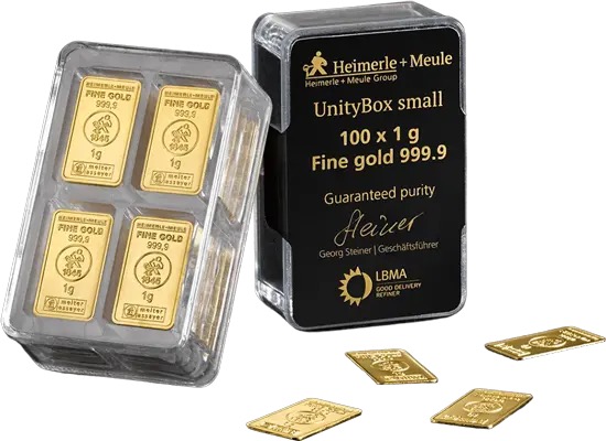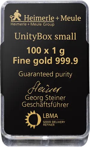Die 100 x 1 g Goldbarren werden in einer hochwertigen UnityBox S ausgeliefert. Im Gegensatz zu herkömmlichen Tafelbarren lässt sich die Box öffnen, sodass die einzelnen 1 g Barren entnommen und bei Bedarf mit passenden Barren von Heimerle + Meule wieder ergänzt werden können.