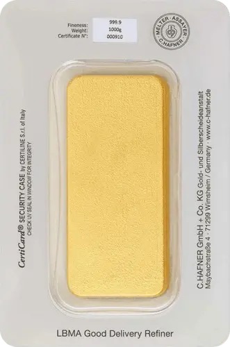 Der 1000 g Goldbarren (1 kg) von C.HAFNER wird aus Feingold „999,9“ gegossen und zählt zu den klassischen Großbarren für langfristige Kapitalanlagen. Sein massives Format, die klare Kennzeichnung und die anerkannte Herstellerqualität machen ihn zu einer verlässlichen, international handelbaren Wertanlage ohne Abschläge.