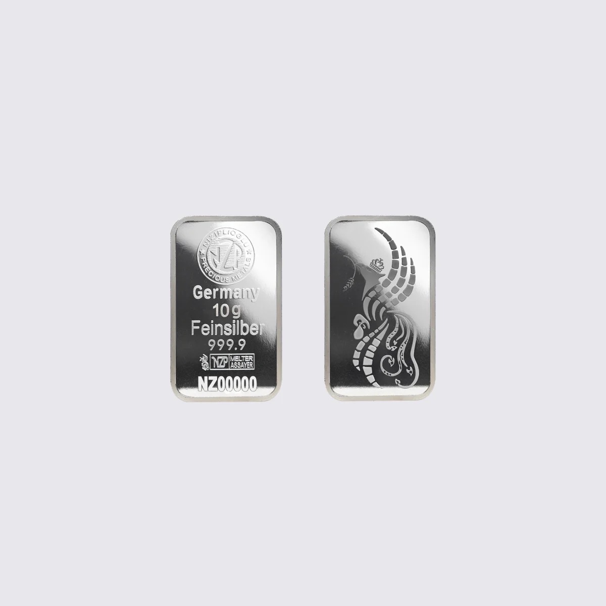 Auf der Vorderseite des Silberbarrens sind der Name des Herstellers, das Feingewicht „10 g“ und die Feinheit „999“ zu finden; zudem der offizielle Prägestempel als Zeichen für Echtheit. Der Barren ist aus Feinsilber (geprägt) gefertigt; Herkunft: Deutschland.