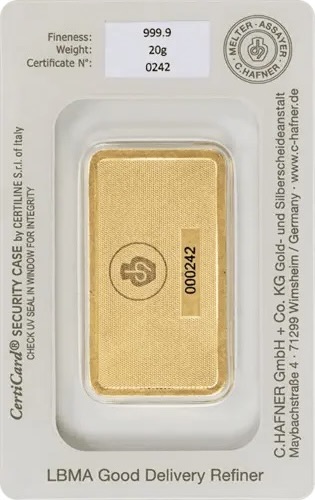 Der 20 g Goldbarren von C.HAFNER wird einzeln in einer CertiCard® Security Case ausgeliefert. Dieser manipulationssichere Sicherheitsblister schützt den Barren optimal vor Kratzern, Schmutz und anderen äußeren Einflüssen und lässt sich nur durch sichtbare Beschädigung öffnen.