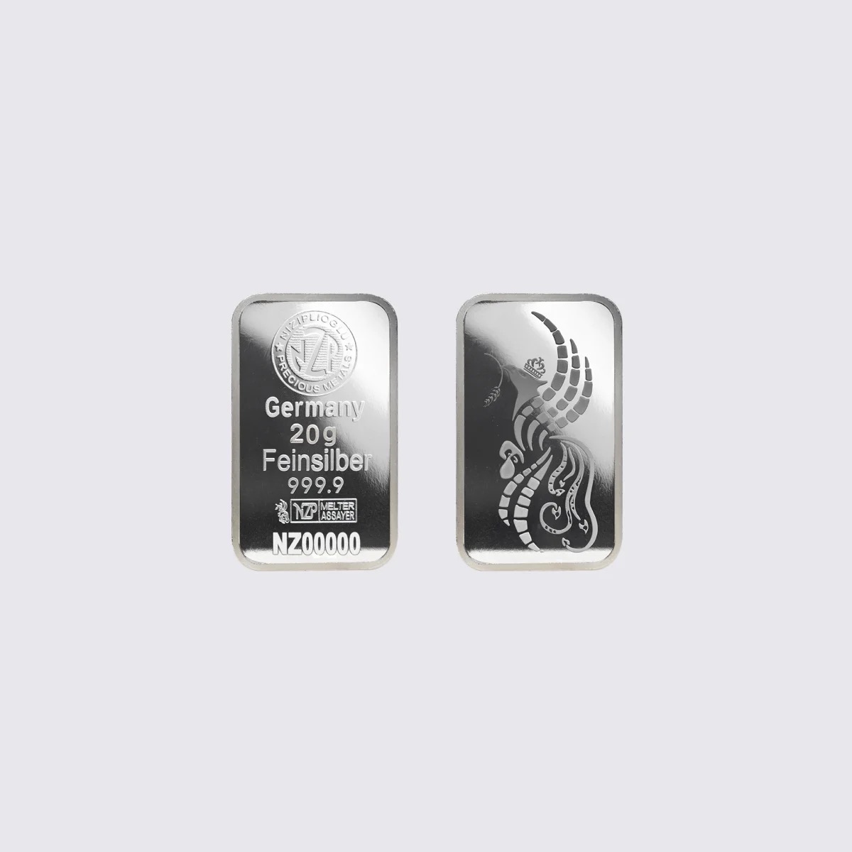 Auf der Vorderseite des Silberbarrens sind der Name des Herstellers, das Feingewicht „20 g“ und die Feinheit „999“ zu finden; zudem der offizielle Prägestempel als Zeichen für Echtheit. Der Barren ist aus Feinsilber (geprägt) gefertigt; Herkunft: Deutschland.