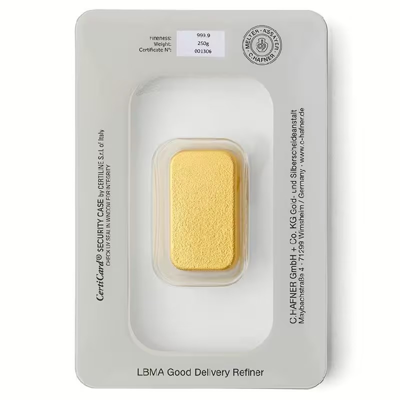 Der 250 g Goldbarren von C.HAFNER wird mit Echtheitszertifikat ausgeliefert. Die Sicherheits- und Verpackungslösung schützt den Barren zuverlässig vor Kratzern, Schmutz und anderen äußeren Einflüssen und macht Manipulationen erkennbar.