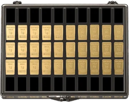 Die UnityBar Collection enthält 30 Goldbarren mit einem Feingewicht von jeweils „1 g“ und einer Feinheit von „999,9“ Feingold.