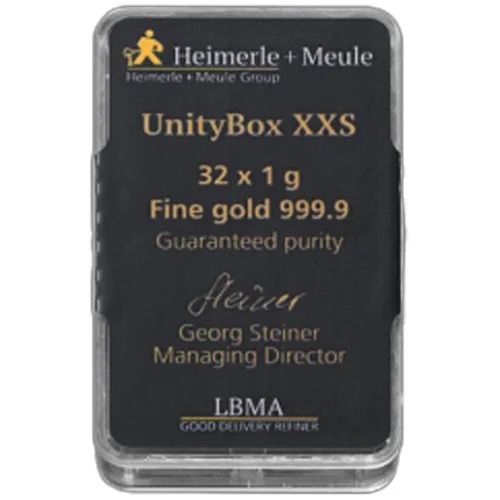 Die 32 x 1 g Goldbarren werden in einer hochwertigen UnityBox XXS ausgeliefert. Im Gegensatz zu herkömmlichen Tafelbarren lässt sich die Box öffnen, sodass die einzelnen 1 g Barren entnommen und bei Bedarf durch passende Barren von Heimerle + Meule wieder ergänzt werden können.