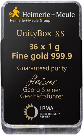 Die 36 x 1 g Goldbarren werden in einer hochwertigen UnityBox XS ausgeliefert. Im Gegensatz zu herkömmlichen Tafelbarren lässt sich die Box öffnen, sodass die einzelnen 1 g Barren entnommen und bei Bedarf mit passenden Barren von Heimerle + Meule wieder ergänzt werden können.