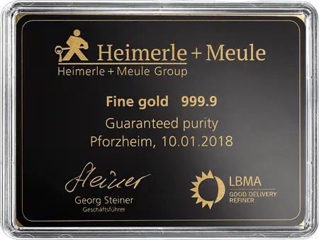 Heimerle + Meule wurde 1845 in Pforzheim gegründet und ist damit die älteste Gold- und Silberscheideanstalt Deutschlands. Das Traditionsunternehmen steht für höchste Verarbeitungsqualität, Präzision und zertifizierte Edelmetallstandards. Als LBMA „Good Delivery Refiner“ verarbeitet Heimerle + Meule überwiegend recycelte Edelmetalle und fertigt Investmentbarren mit einer Feinheit von „999,9“, die international anerkannt und ohne Abschläge handelbar sind.
