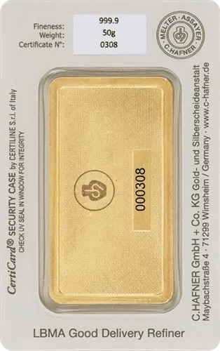 Der 50 g Goldbarren von C.HAFNER wird einzeln in einer CertiCard® Security Case ausgeliefert. Dieser manipulationssichere Sicherheitsblister schützt den Barren optimal vor Kratzern, Schmutz und anderen äußeren Einflüssen und lässt sich nur durch sichtbare Beschädigung öffnen.