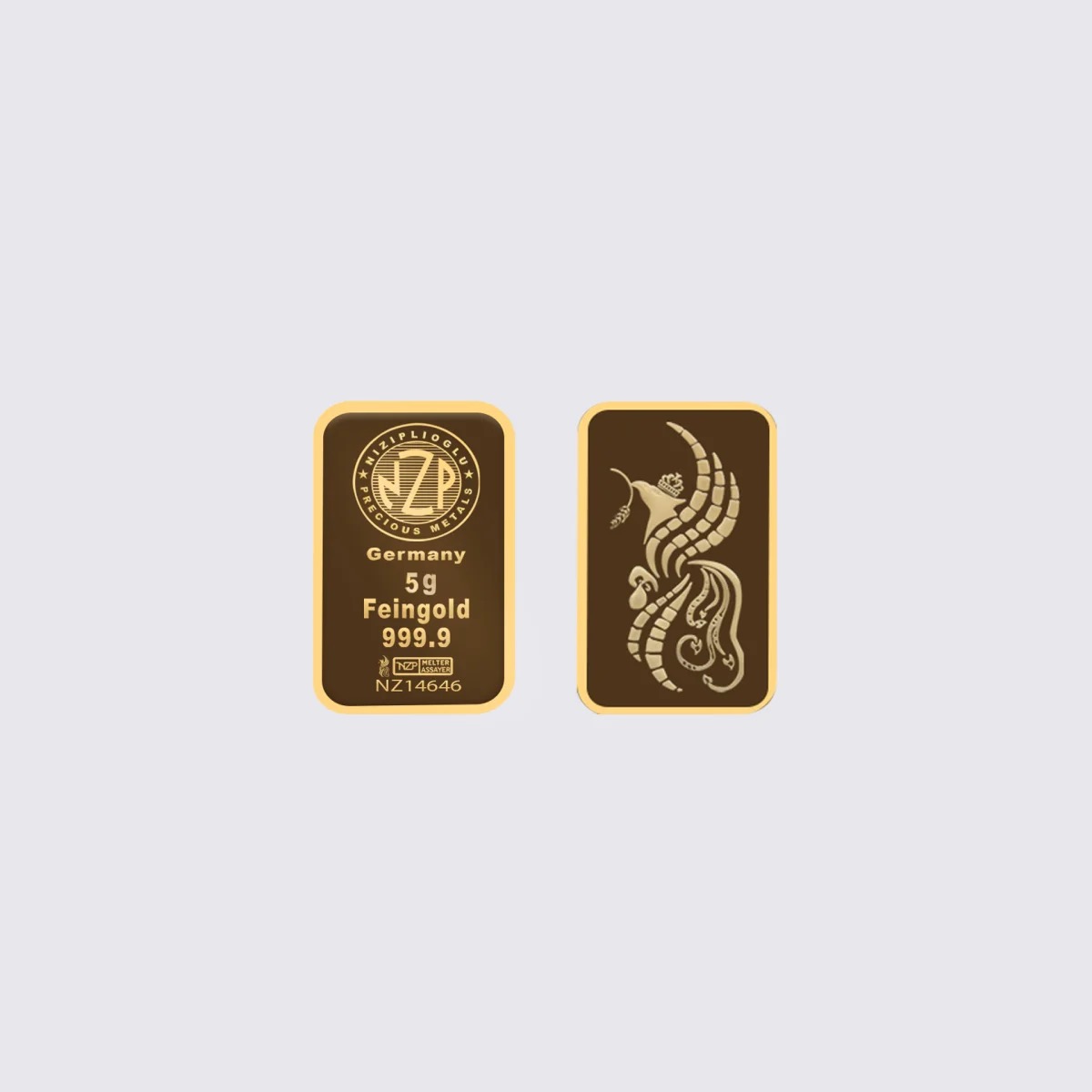 Auf der Vorderseite des Goldbarrens sind der Name des Herstellers, das Feingewicht „5 g“ und die Feinheit „999,9“ geprägt. Außerdem ist der offizielle NZP-Prägestempel als Zeichen für Echtheit und Qualität zu sehen. Der Barren ist aus Feingold (geprägt) gefertigt; Herkunft: Deutschland.
